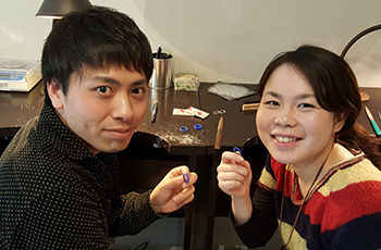 奥様は百貨店等で結婚指輪をいろいろご覧になっていらしたようで、デザインはかなり悩まれましたがサンプルをつけてみて波型に決まりました。刻印と、奥様の方にはさらにダイヤモンドを3石入れることになりました。お二人とも集中して作成されていたので3時間程で完成しました!